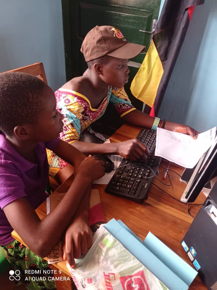 Gut besetzt ist derzeit das Azoli Yéyé, unser Mädchenhaus: die PC-Grundlagenkurse finden jetzt in den Schulferien statt, wie man sieht, auch für die jüngeren Kinder. Gut zu sehen, sind hier die schönen Tische aus heimischem Teakholz, von den Schreinern aus dem Ort gezimmert.